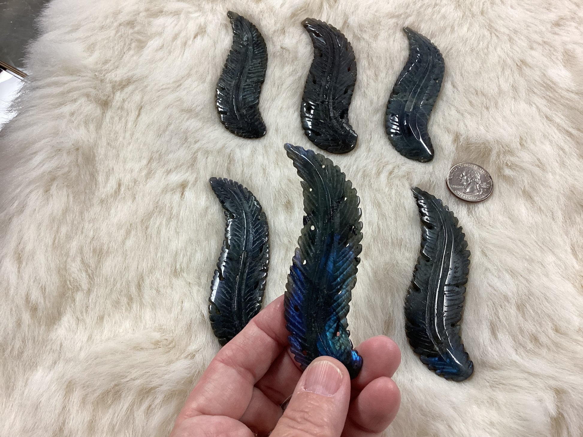 Natural Labradorite Feather. Labradorite is found in Madagascar.